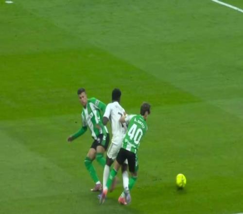 在2025-26赛季西甲第18轮,皇家马德里主场对阵皇家贝蒂斯。主裁判两次做出争议判罚,维尼修斯、巴尔特拉两次禁区内倒地之后都没有判罚点球。比赛的第5分钟,维尼修斯突入禁区左肋
